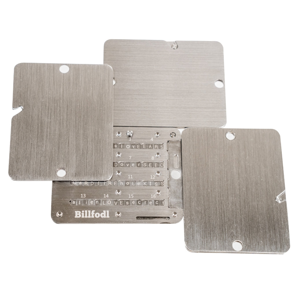 Each Billfodl package comes with the main steel unit or chassis and a set of over 300 character tiles. After you have received you 12 or 24 word recovery phrase (otherwise known as a recovery seed, seed phrase, or mnemonic phrase), you will open your Billfodl and the provided pack of character tiles and you will spell out the first four letters of each word and slide them into the main unit. The Billfodl main unit has labels above each slot so you know which word of your seed goes where.